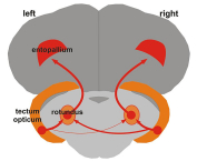 There is something mysterious about olfaction. It is the only sense that directly enters the forebrain without a thalamic relay. It also has tight links with the limbic system; creating the myth that olfaction is a strong gateway into emotional memory. Pigeons also use olfactory cues to navigate over unfamiliar areas, and any impairment of the olfactory system generates remarkable reduction of homing performance. This special function of olfaction is also lateralized: Studies suggest a critical involvement of the right olfactory bulb (OB) and the left piriform cortex (CPi) for initial orientation. Unfortunately, the structural organization of the olfactory system is by far not clarified yet. Thus, a team of Biopsychologists from Bochum and Witwatersrand (South Africa) re-analyzed the system by antero- and retrograde tract tracing with biotinylated dextran amine and choleratoxin subunit B, and especially evaluated quantitative differences in the number of cells in the OB innervating the left and right CPi. They verified a strong bilateral input to the CPi, and the prepiriform cortex (CPP), as well as small projections to the ipsilateral medial septum and the dorsolateral corticoid area and the nucleus taeniae of the amygdala in both hemispheres. The adjacent picture depicts some of the olfactory components within a 3D-view of the pigeon brain. However, the authors could not reveal any asymmetries within in the projections described. Thus, the functional lateralization of the olfactory system is not simply based on differences in the number of projecting axons of the major processing streams.